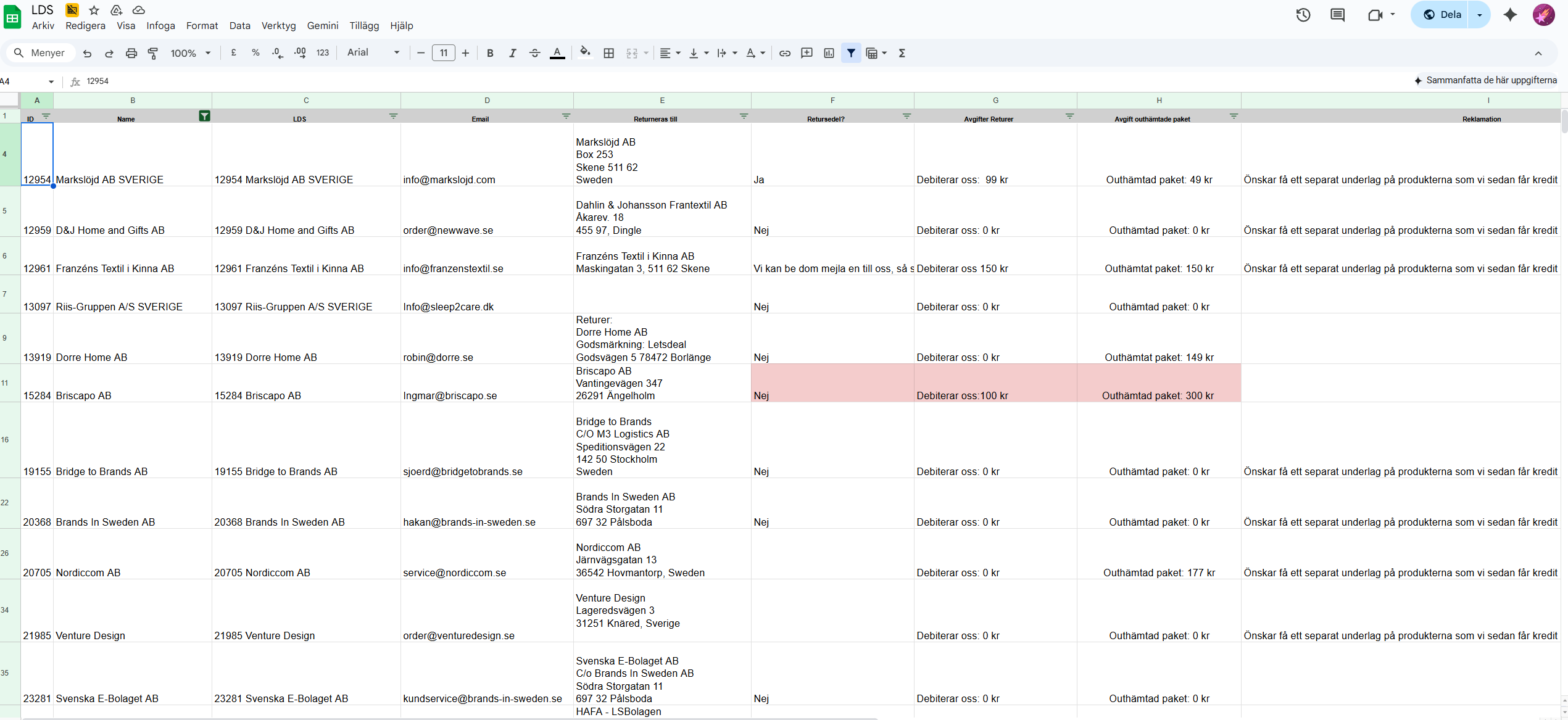Här kan du även hitta vilka returadresser som gäller, vad som ska tas i avgift vid returhantering osv. Mycket av denna informationen finns även att läsa på enskilda partnerkort.