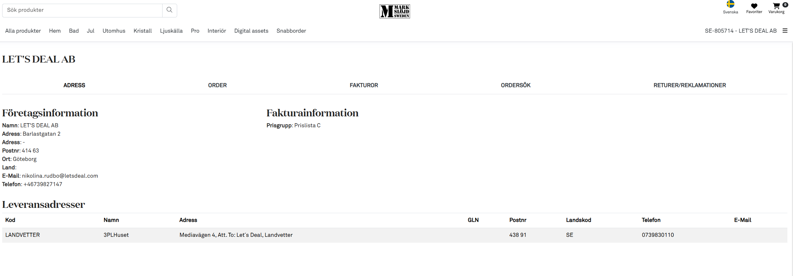 Markslöjd har en egen b2b-portal som gör att vi kan spåra paket och returer. Du hittar den här: https://b2b.markslojd.com/customers/SE-805714