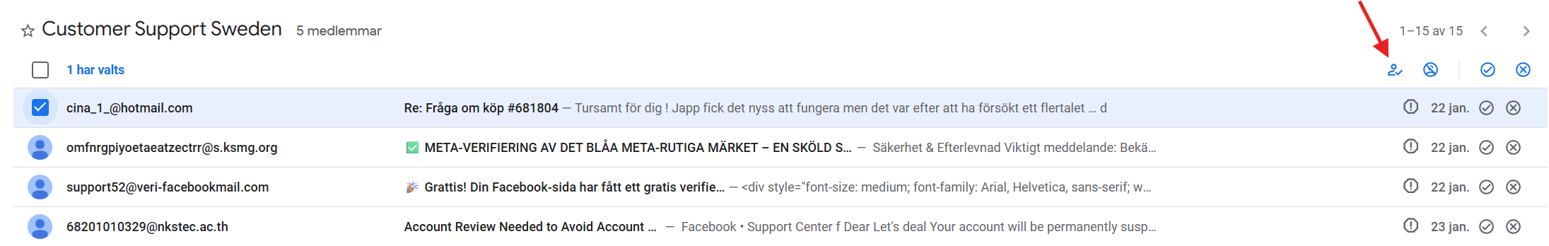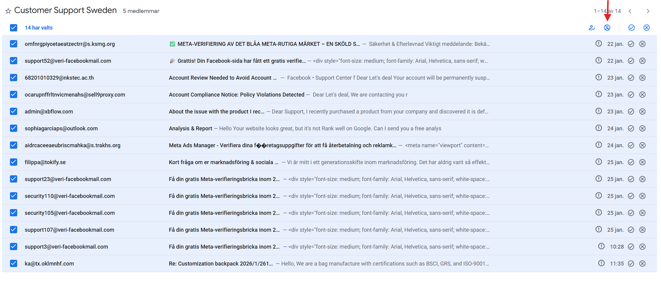 Därefter markerar vi resterande mejl och trycker på den lilla gubben som är överstruken, detta för att att blockera mejladresserna och ta bort mejlen.