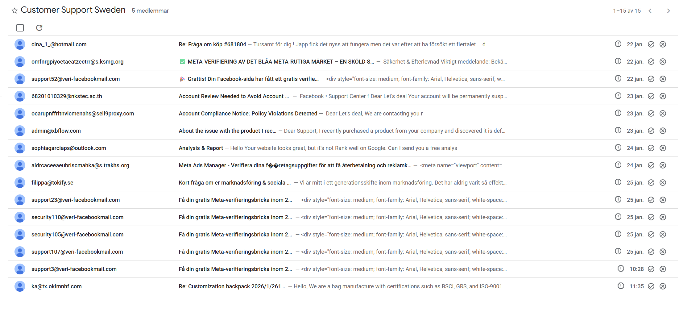 Man trycker helt enkelt upp varje länk och kikar igenom varje inkorg. Här är ett exempel från Customer Support Sweden-inkorgen.